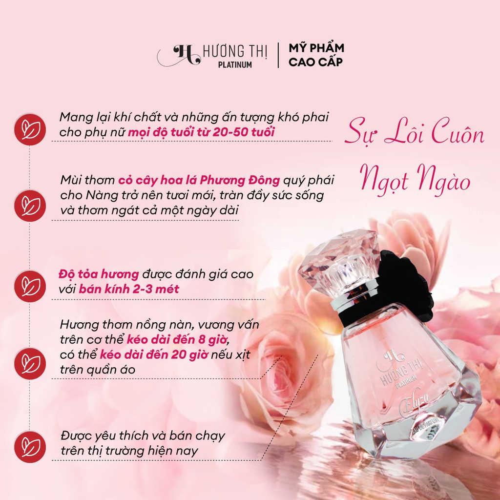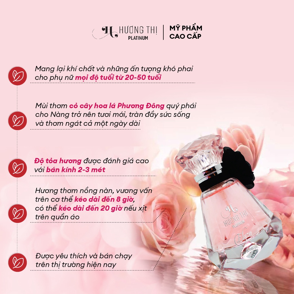 ✨Độ tỏa hương nước hoa nữ Elyza được đánh giá cao với bán kính 2-3 mét. Hương thơm nồng nàn vương vấn trên cơ thể qua từng cung bậc kéo dài đến 8 giờ khi sử dụng. Có thể kéo dài đến 20 giờ nếu xịt trên quần áo.